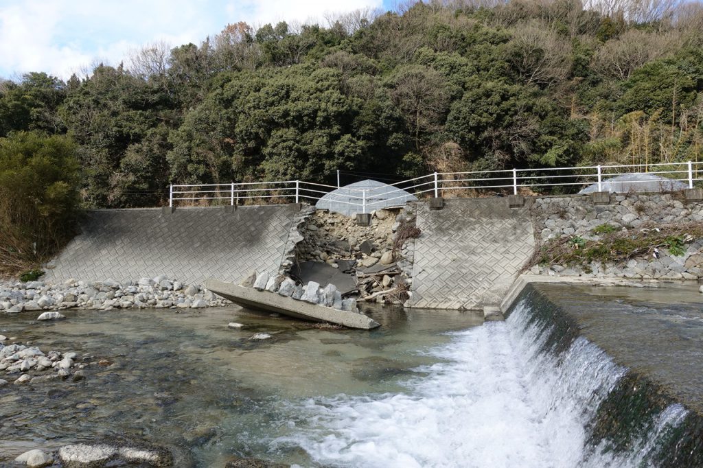 河川の増水により側壁が崩れ、路面が崩落した道路の3Dモデルです。今回は崩落個所が複数に及んでいたので、特に崩れ方が大きい3箇所をモデル化しました。